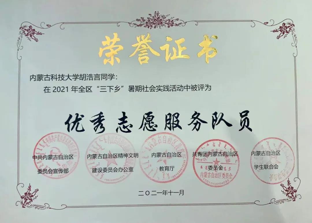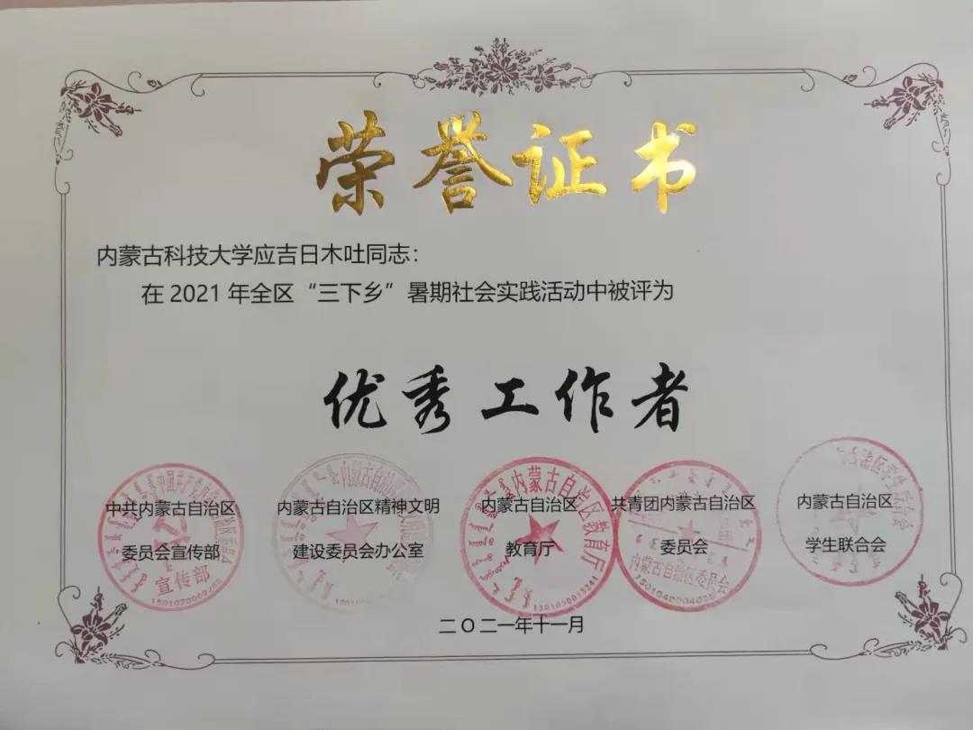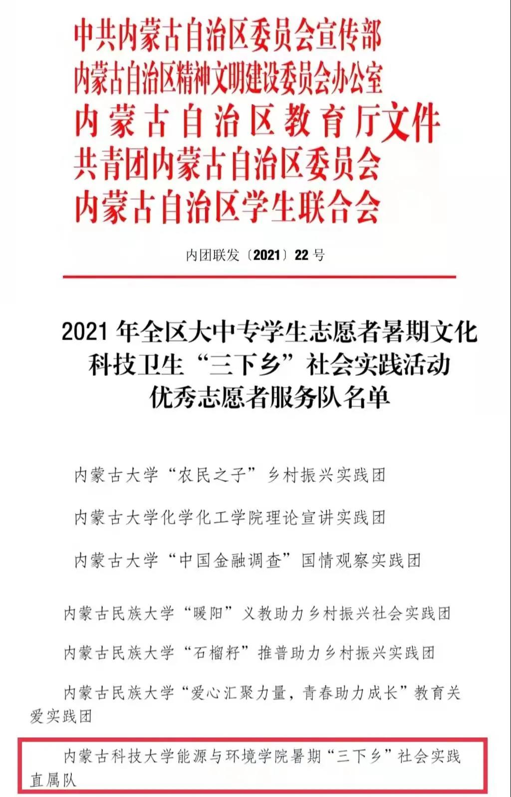 近日,中共内蒙古自治区委员会宣传部、内蒙古自治区精神文明建设委员会办公室、内蒙古自治区教育厅、 共青团内蒙古自治区委员会、内蒙古自治区员工联合会联合印发《关于表彰 2021年全区大中专员工志愿者暑期文化科技卫生“三下乡”社会实践活动先进集体和优秀个人的决定》,表彰在2021年暑期“三下乡”社会实践活动中表现优秀、成绩突出的集体和个人。公司2021年暑期“三下乡”社会实践直属队获评“优秀志愿者服务队”荣誉称号,指导教师应吉日木吐获评“优秀工作者”荣誉称号,给排水19-2班志愿者胡浩言获评“优秀志愿者服务队员” 荣誉称号。