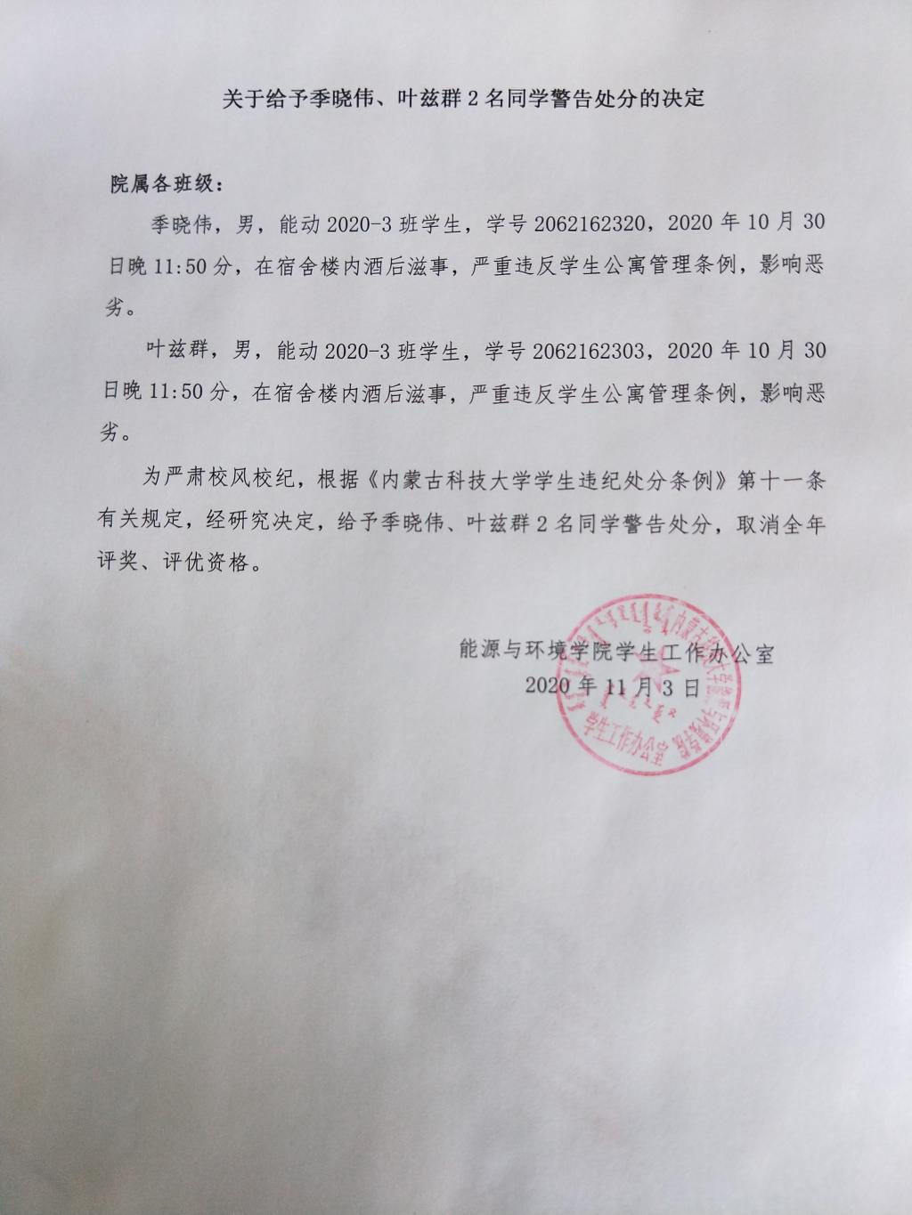 关于给予季晓伟、叶兹群2名同学警告处分的决定