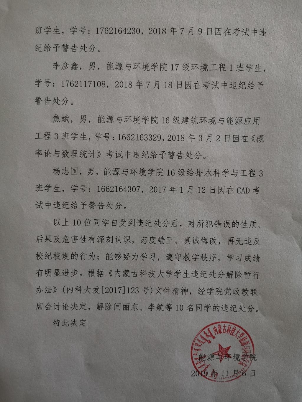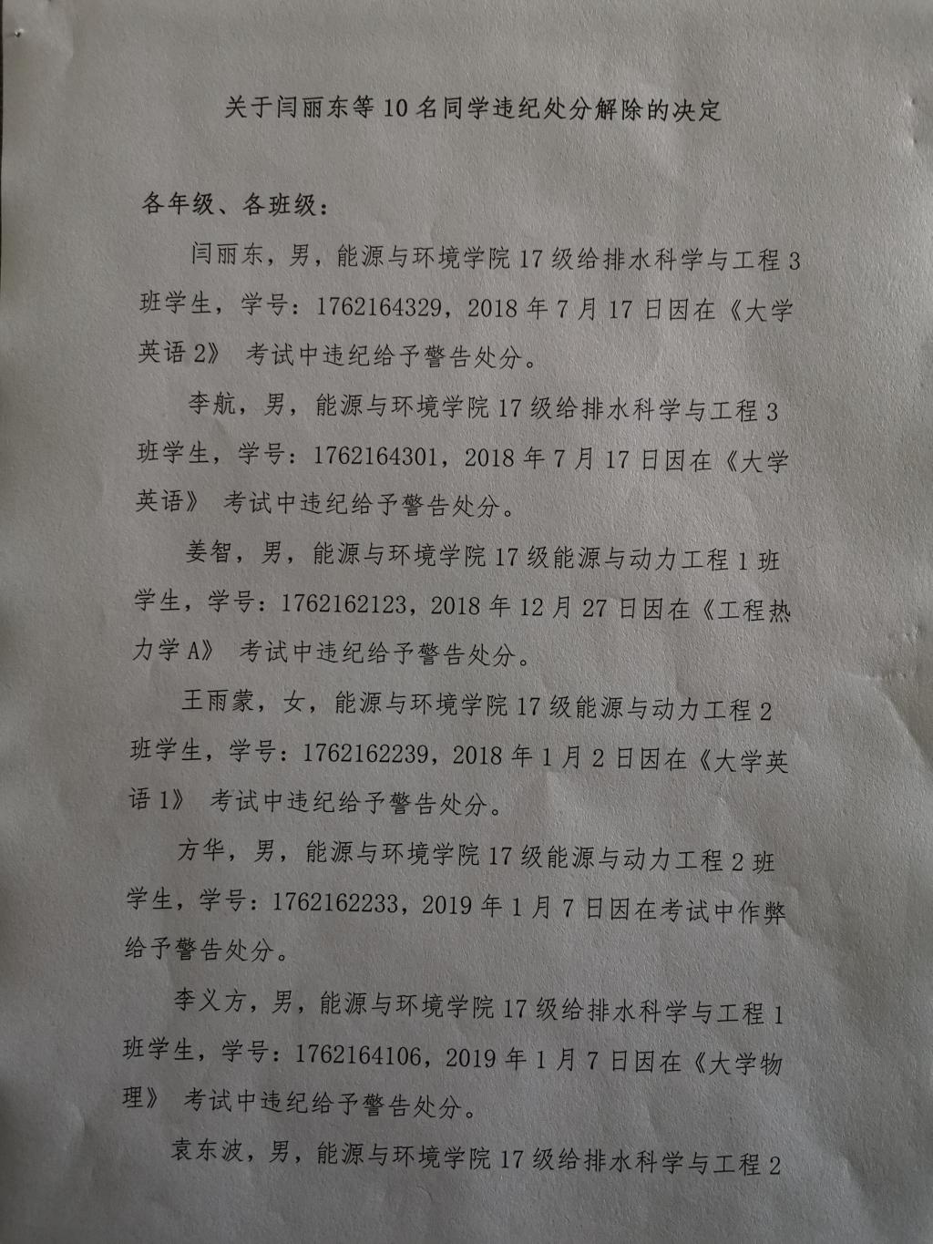 关于闫丽东等10名同学违纪处分解除的决定