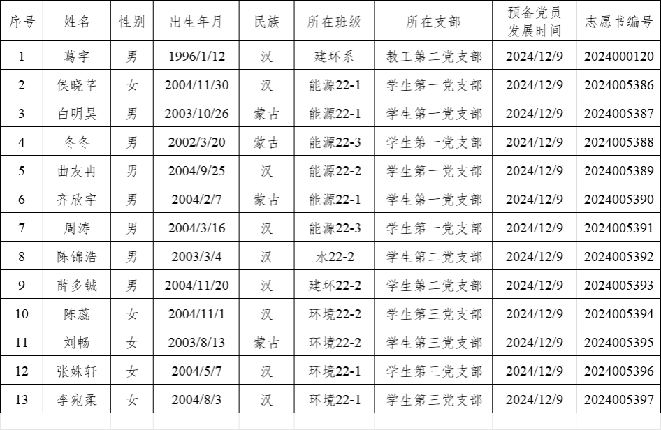 公示期从 2025 年 12 月 1 日至 2025 年 12 月 7 日止。在公示期内,任何单位和个人均可采用电话、信函或直接来访的形式,向太阳成集团tyc33455cc官网党委反映葛宇等十三位同志在政治立场、理想信念、思想品德、入党动机、工作表现、廉洁自律和遵纪守法等方面的情况,同时也可反映基层党组织在发展党员工作中坚持党员标准和发展党员工作程序等方面的情况。反映问题要求实事求是,客观公正。